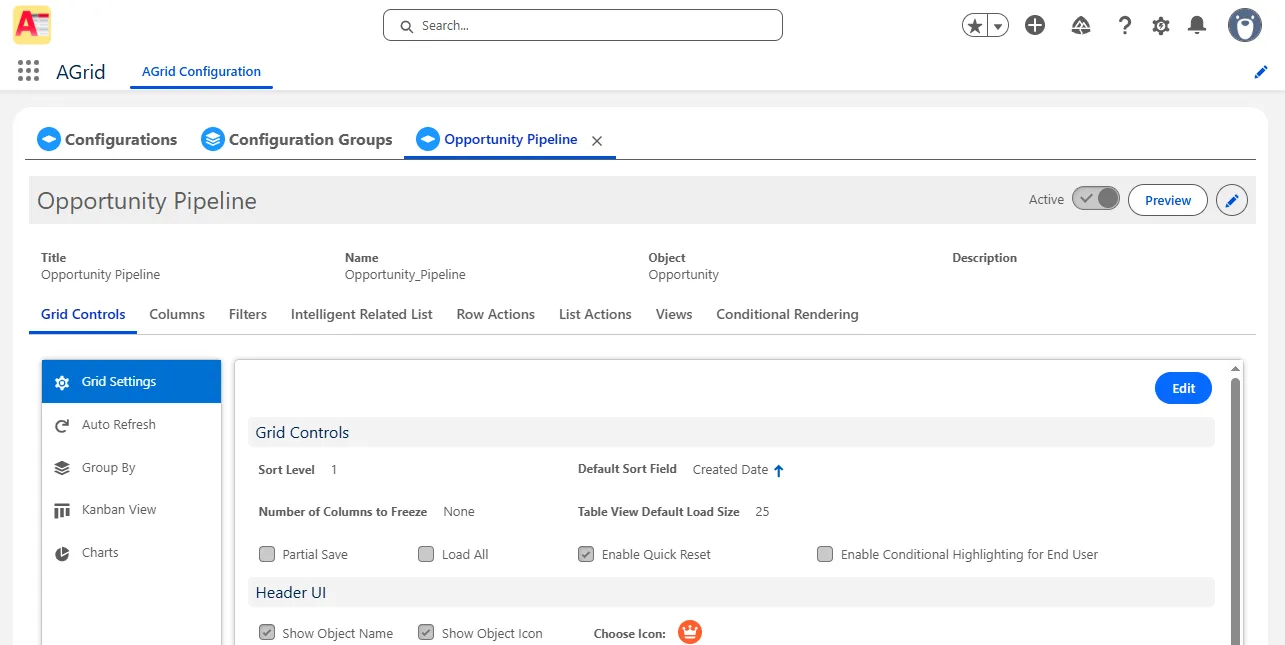 AGrid is an actionable grid for Salesforce that renders object data as a configurable list view with filtering, sorting, grouping, inline editing, and actions.
