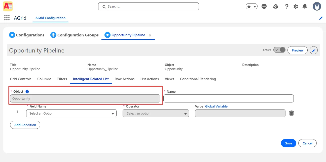 Open or create an AGrid Configuration for Opportunity