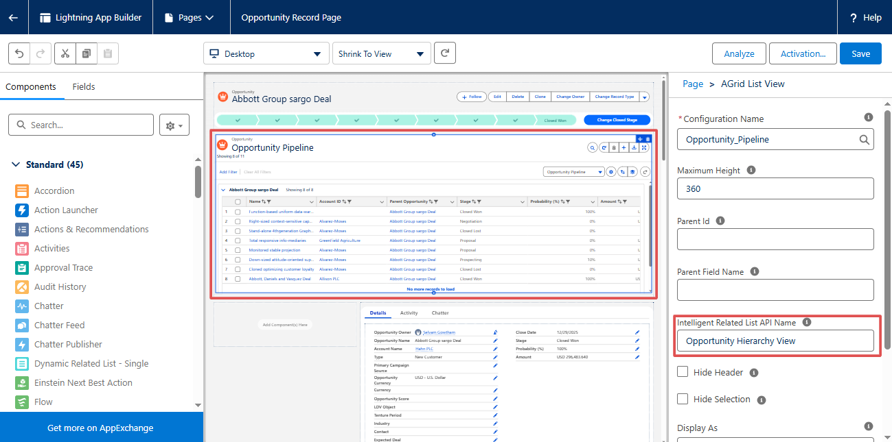 Save the page. When you return to the Opportunity record, you’ll see all related child and grandchild Opportunities in one AGrid grid.