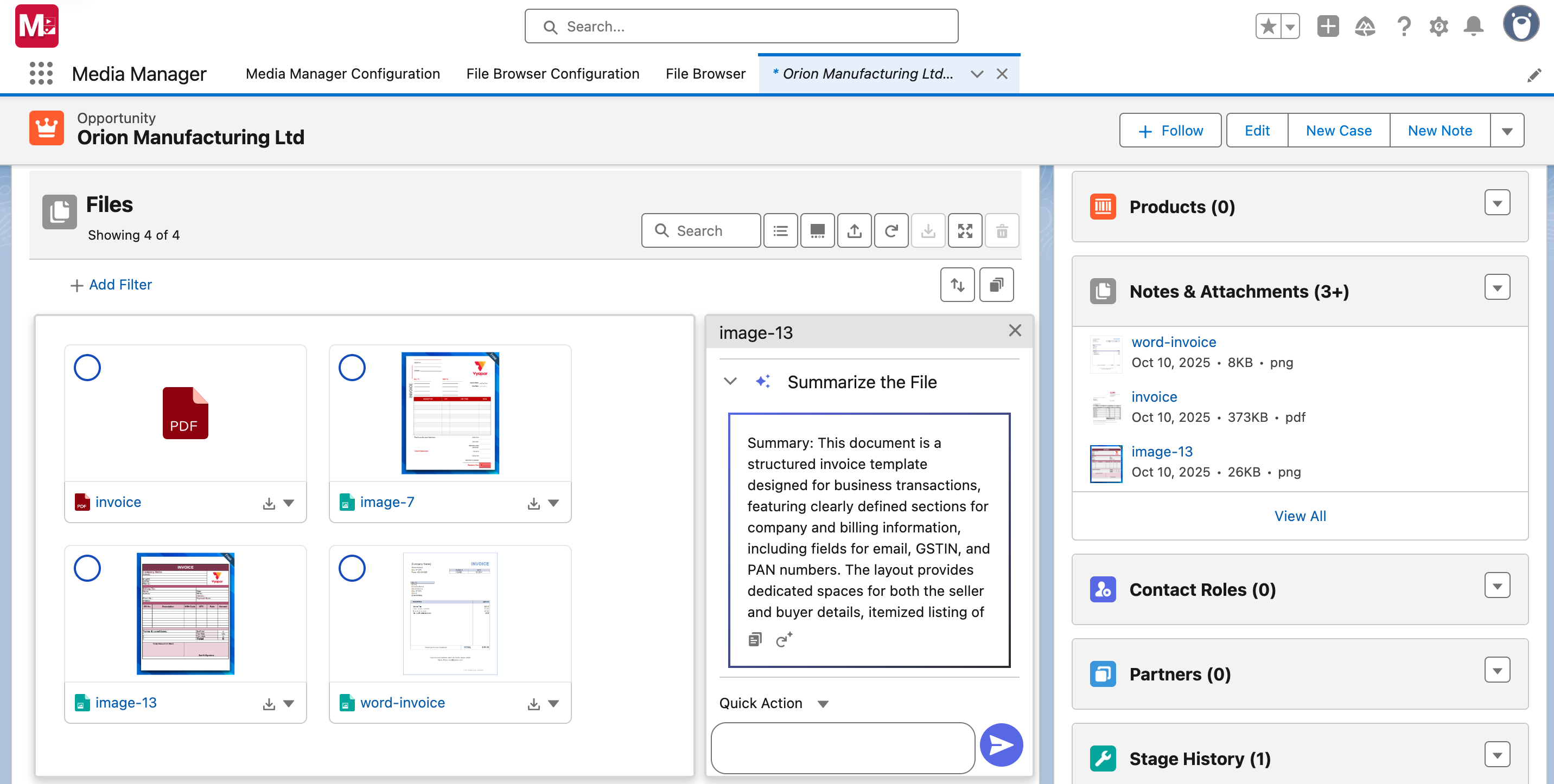 With Media Manager, every file—be it a supplier invoice, quality certificate, or delivery note—sits in one central location within Salesforce. No more bouncing between drives or downloading attachments. Quick previews across PDFs and images mean you can verify details instantly without wasting clicks. Organized folders and related list actions keep documents tied to the right records, creating a foundation for document workflow automation in Salesforce.