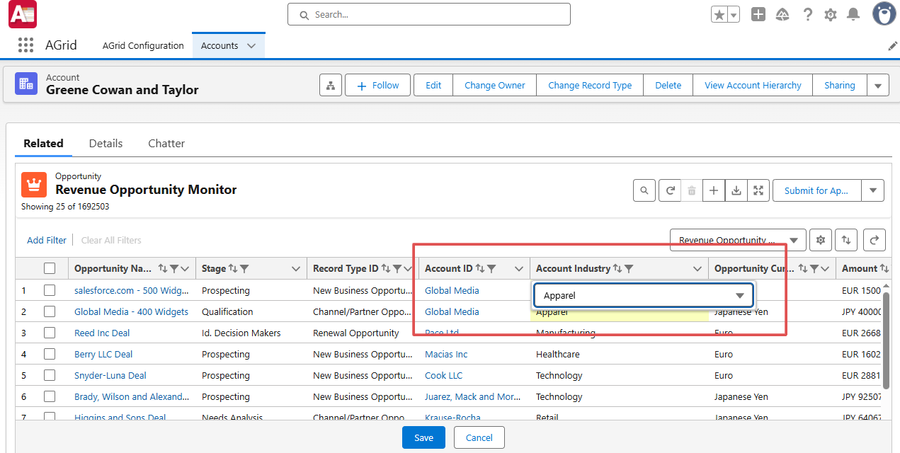- Edit direct parent fields—e.g., Account Industry from an Opportunity grid