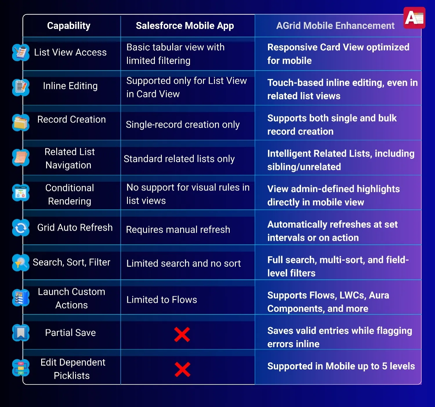 Salesforce mobile is great for looking. AGrid Mobile is built for doing.