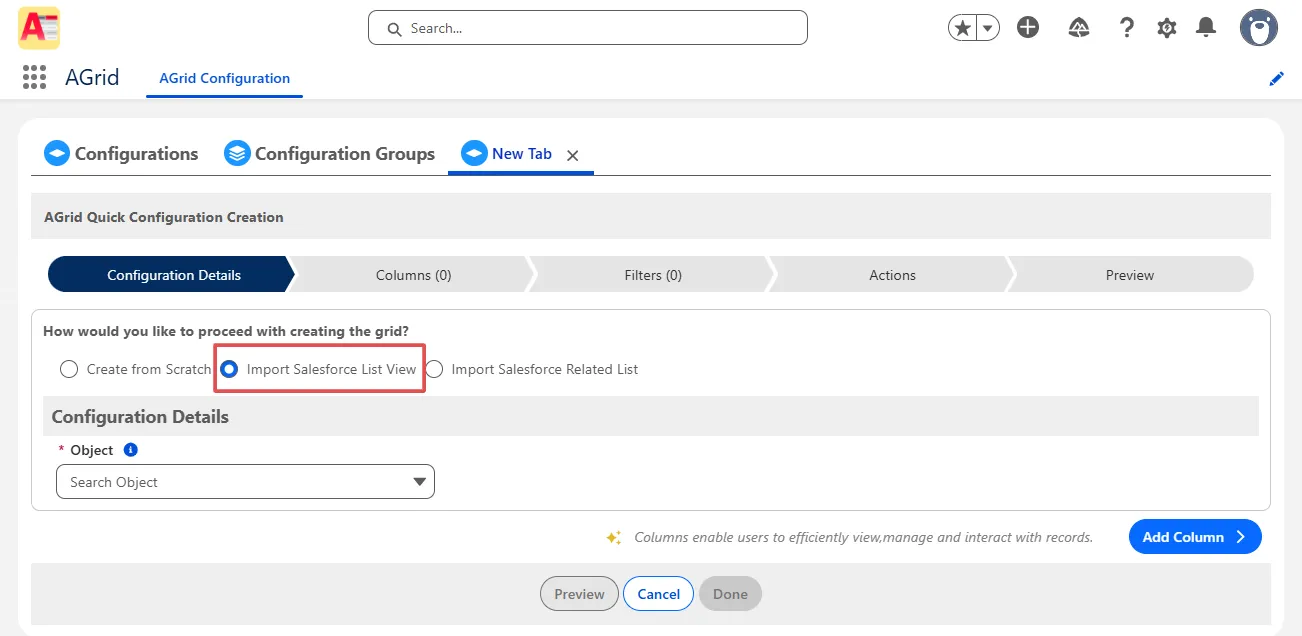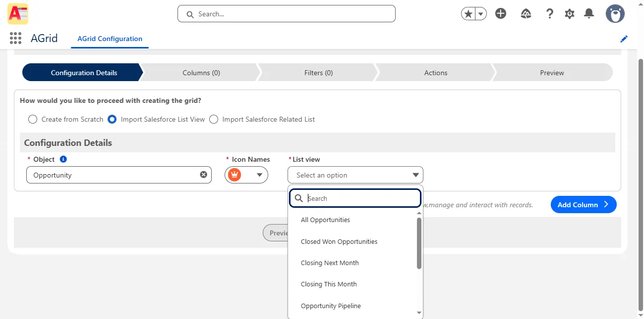 AGrid makes it easy to start by importing an existing Salesforce List View and guiding it through a structured setup flow. To get started, open the AGrid app from the App Launcher and navigate to Configurations tab. Click on New to Create a new configuration and choose Import Salesforce List View. When you choose Import from Salesforce List View, the configuration follows five clear steps.