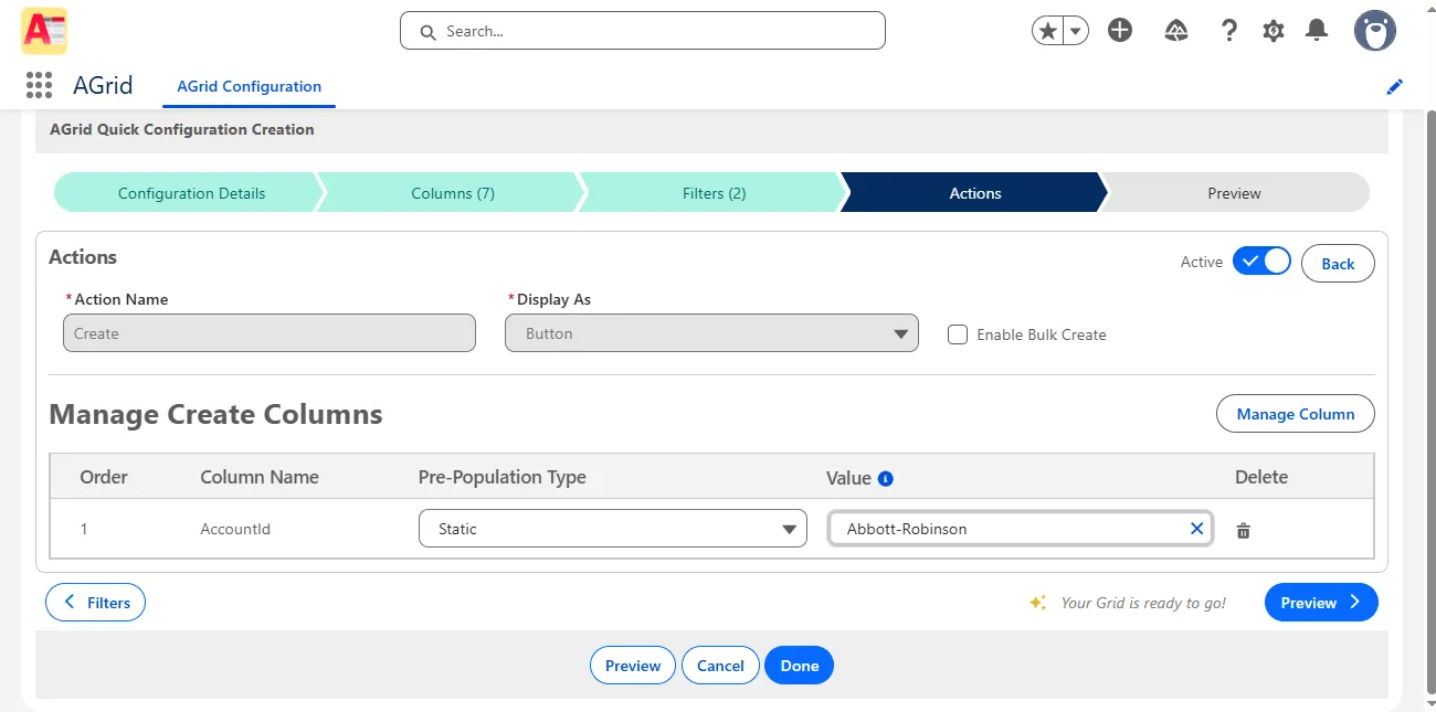 Before finalising, the Preview step shows exactly how the grid will behave—columns, filters, and actions included.