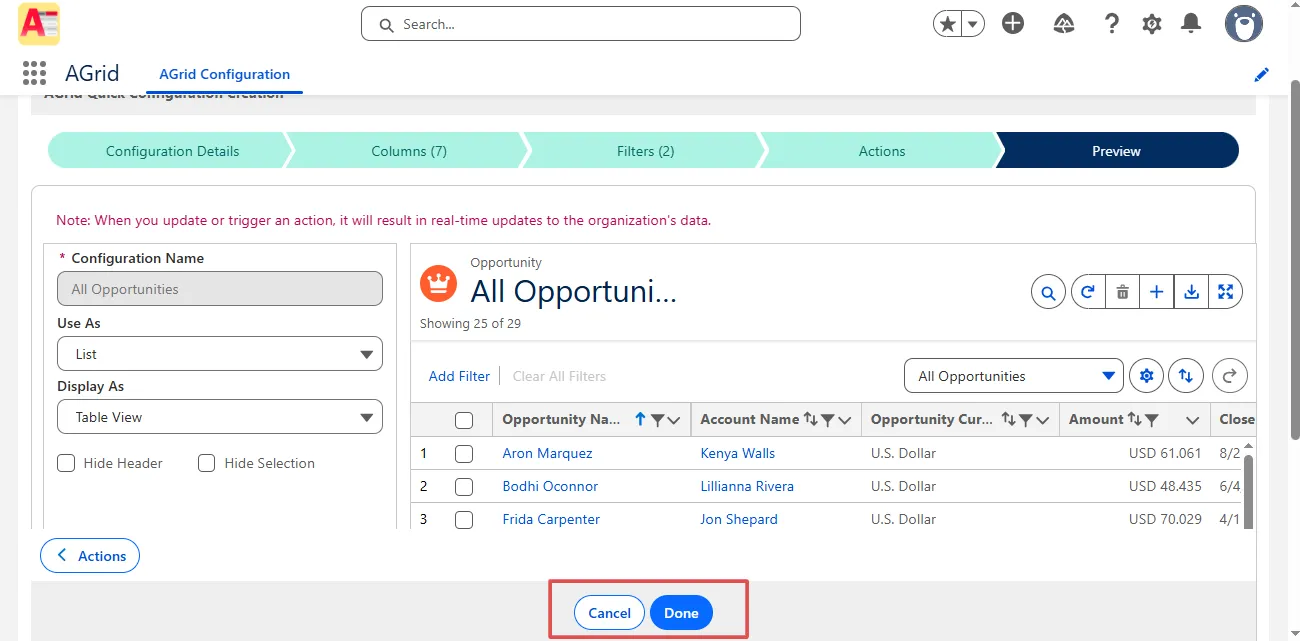 Once reviewed, clicking Done completes the configuration. The grid is now ready to be used on Lightning pages.