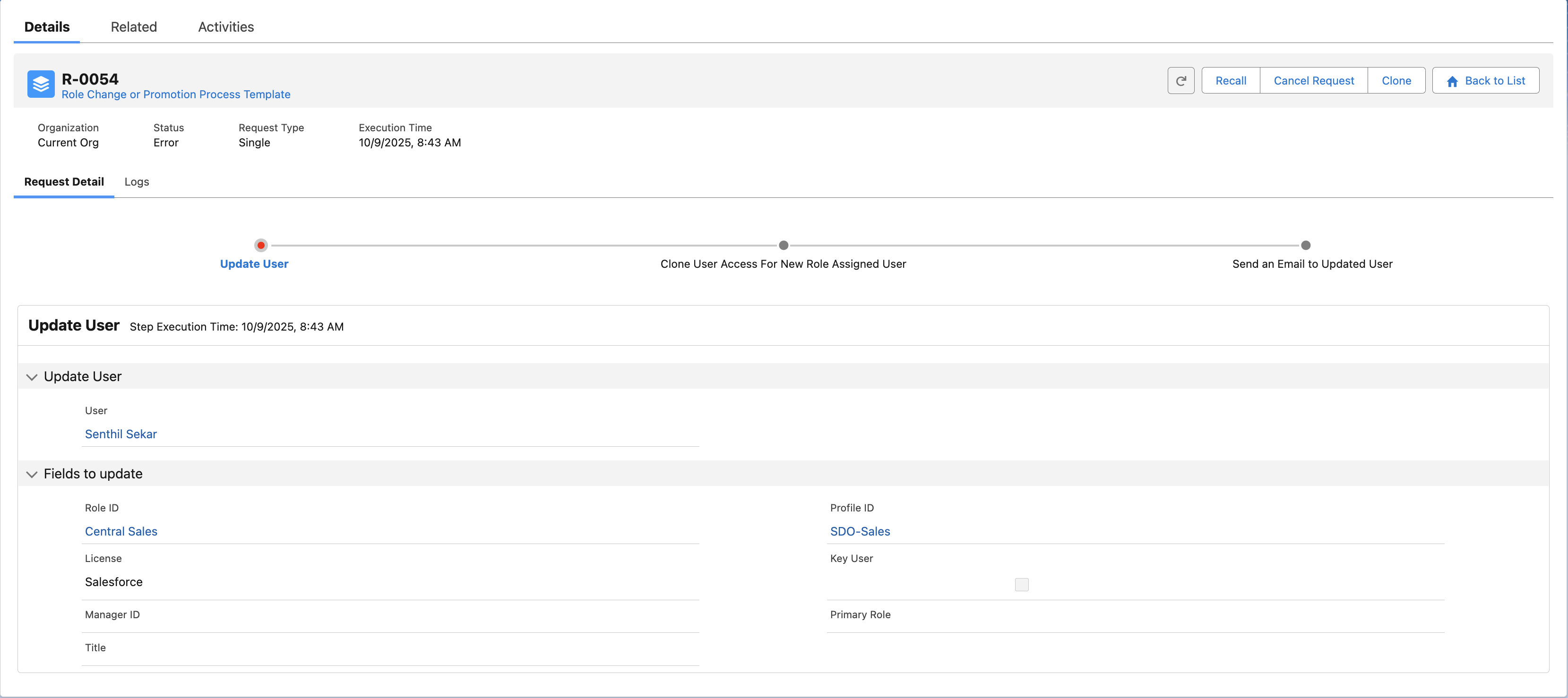 In User 360, everything begins with a request — because it keeps the process structured, repeatable, and auditable. For Sarah, this means role changes no longer involve scattered updates across Salesforce. Instead, she follows a clear path:
