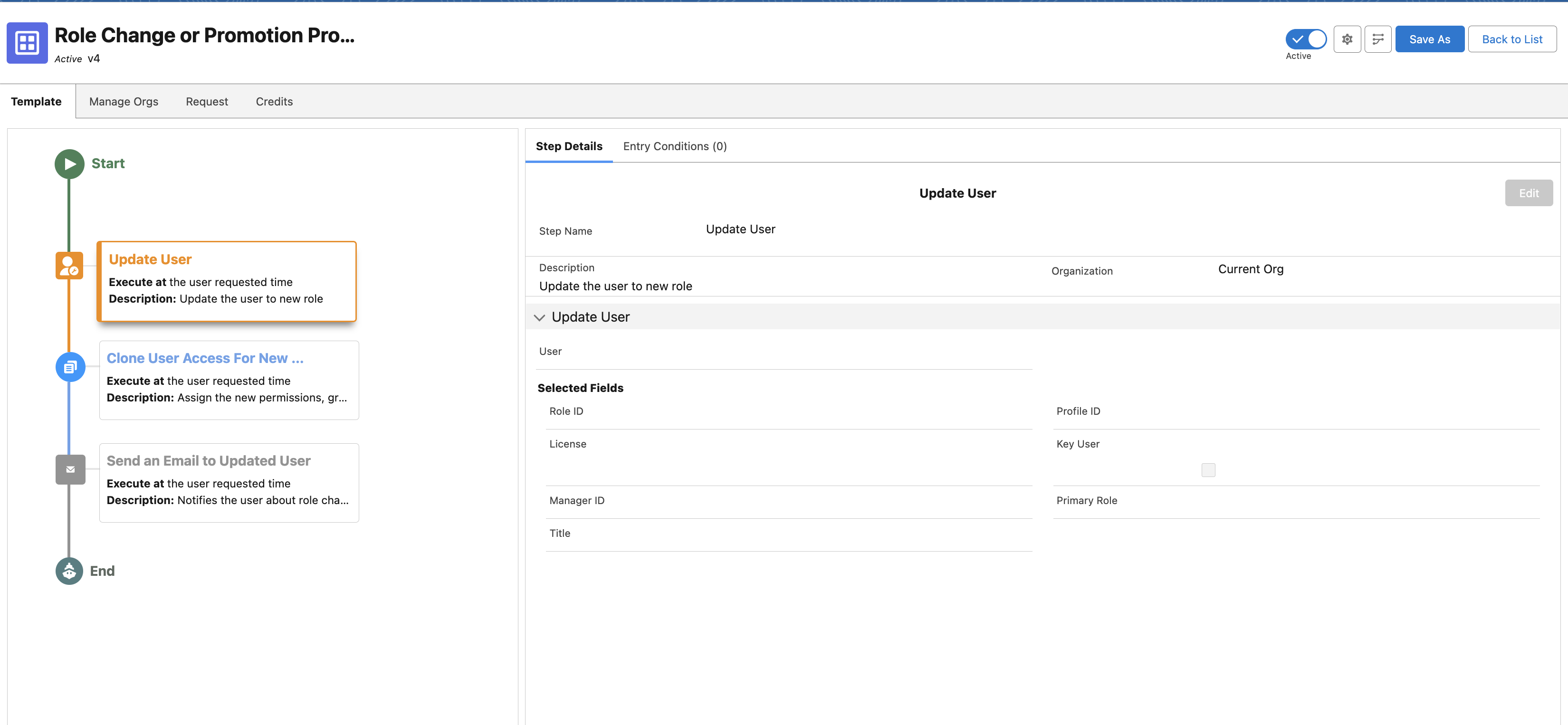 - Process Templates: Define all role-change steps once — update details, assign new permissions, revoke old ones, add to groups, even send notifications. Every promotion runs the same way, consistently.