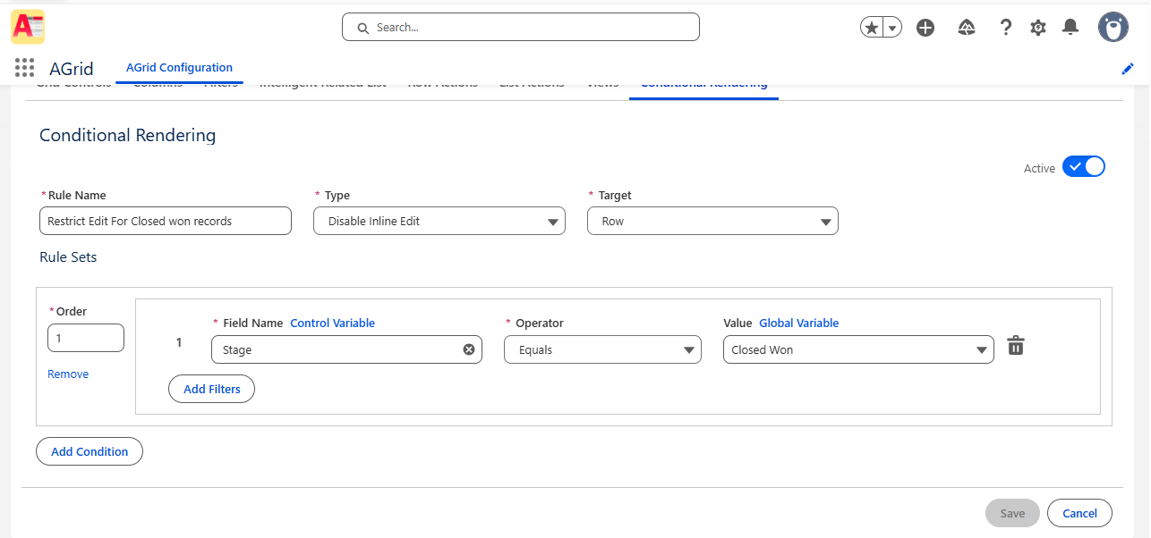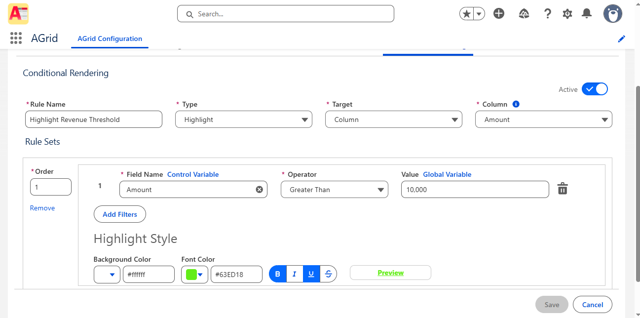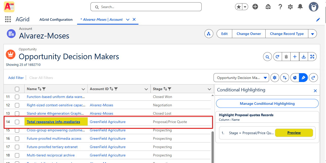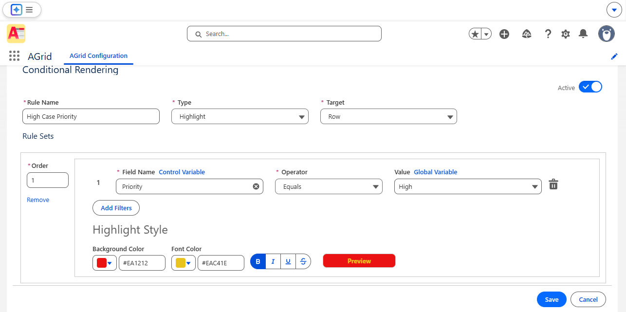 AGrid extends conditional highlighting directly into Salesforce list views and related lists — enabling row-level emphasis, contextual action control, inline edit governance, and user-level personalization.