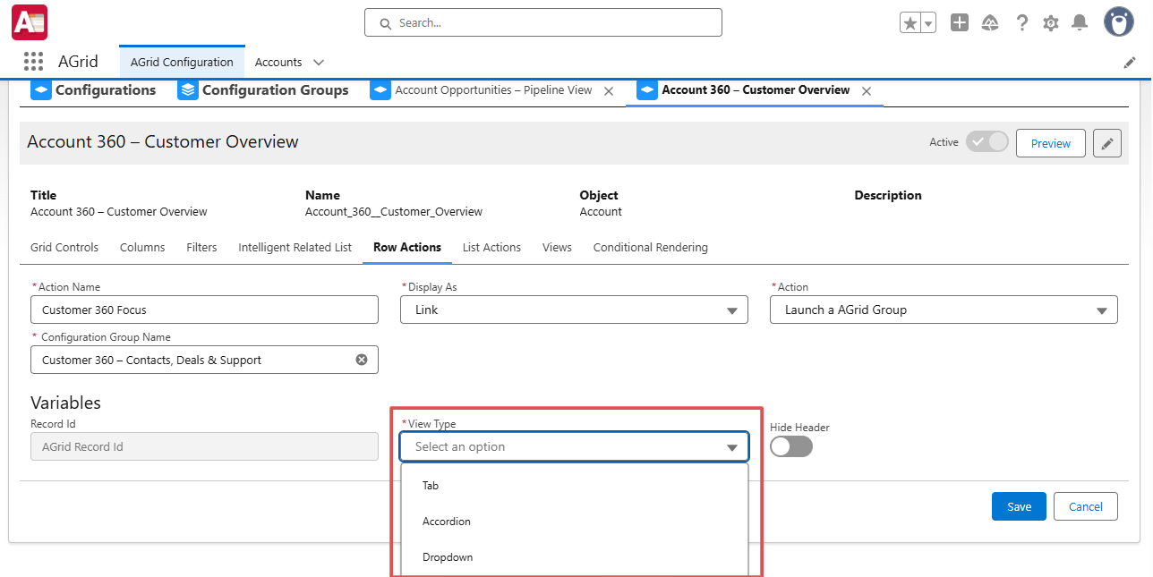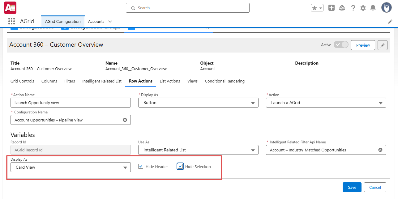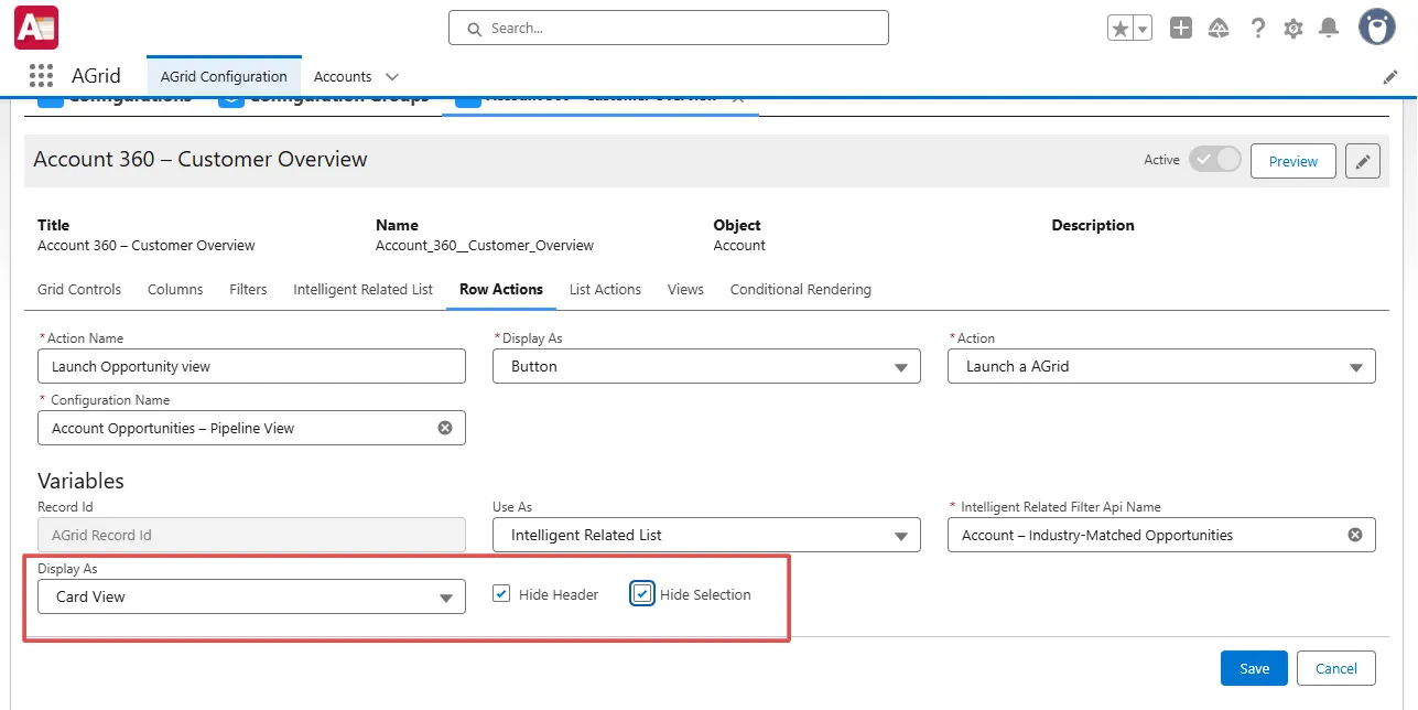 AGrid is a configurable Salesforce grid that goes beyond standard list views. It gives users interactive features like filters, Conditional Rendering, Kanban view, and charts—all without code. But one of its most powerful capabilities lies in row actions.