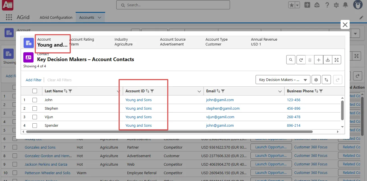 That’s where AGrid’s Row Actions come in. With features like Launch AGrid and Launch AGrid Groups, users can open other grids—or even multiple grouped grids—right from a row. No extra navigation, no lost context. Just Salesforce Related Records Instantly.