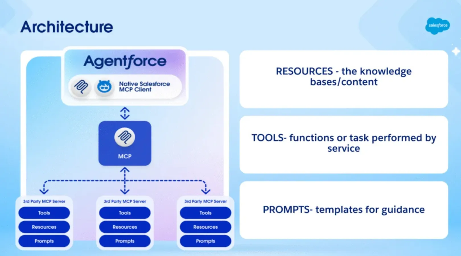 In simple terms, MCP gives AI agents a standard way to connect with tools, data, and services. Instead of building a separate custom integration for every agent interaction, teams can use a more structured approach. Salesforce developer documentation describes MCP as foundational to Agentforce’s agentic capabilities because it standardizes tool discovery, execution, and results integration.