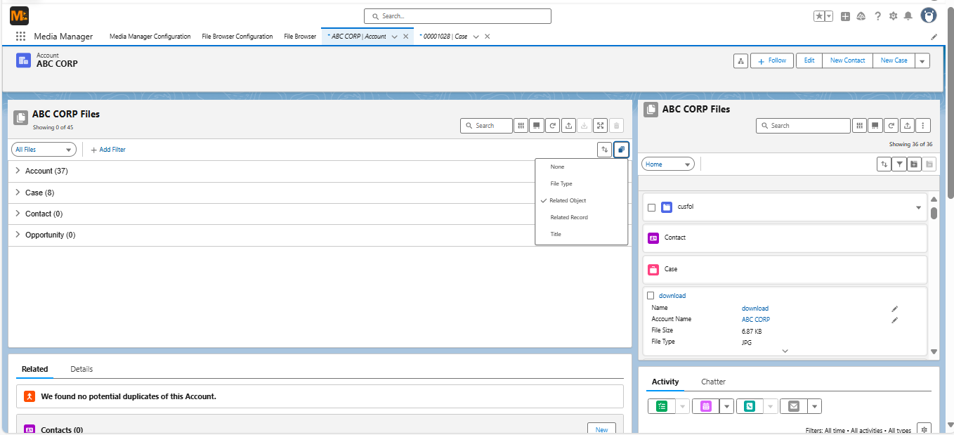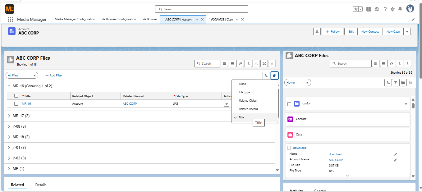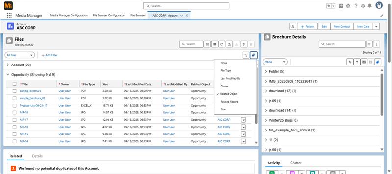 Smart Grouping with Related Object works alongside Media Manager’s File Tree to display files across connected records in one view. For example: