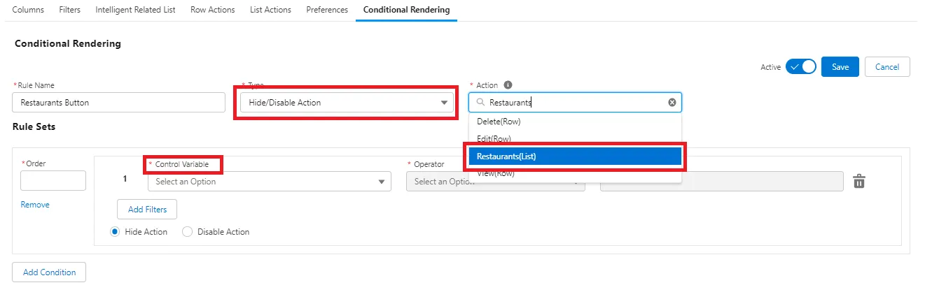Also, custom list actions can now be hidden based on Profile or Permission. Admins can set up conditional rendering rules to ‘Hide/Disable Action’ for a created List Action, though this feature only supports control variables.