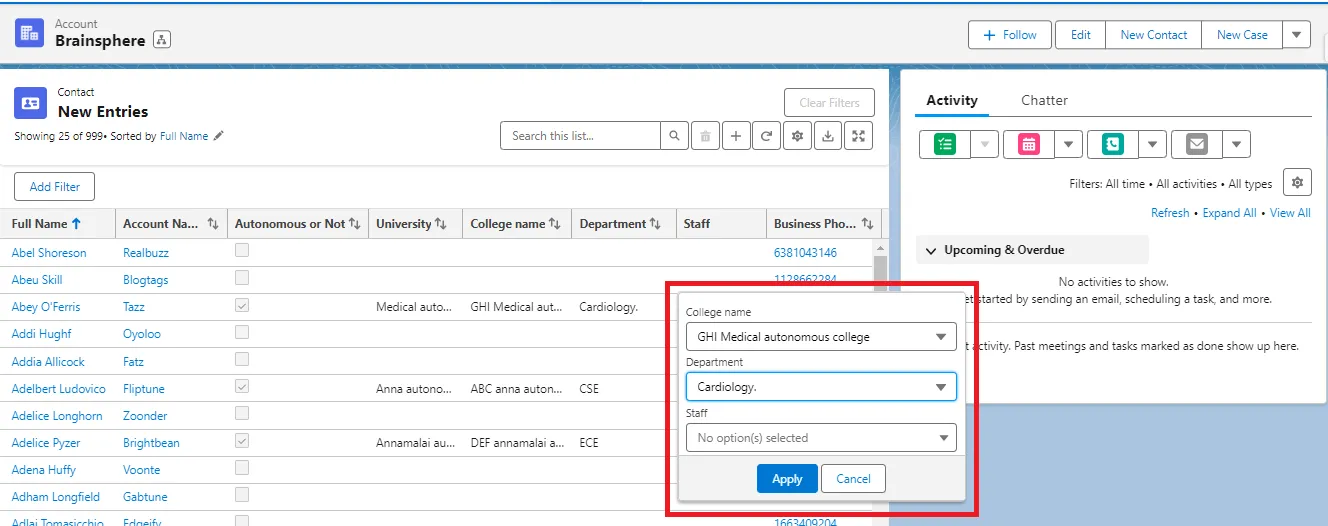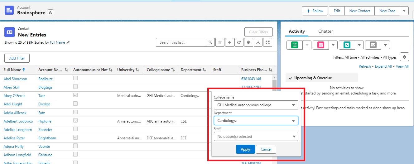 Let’s take this for an example: The following fields are dependent on another field in the ascending order – Staff, Department, College, University, Autonomous or not. So now, when one of these fields is selected on the AGrid, this is how the users will be able to see up to 3 levels. Demo video