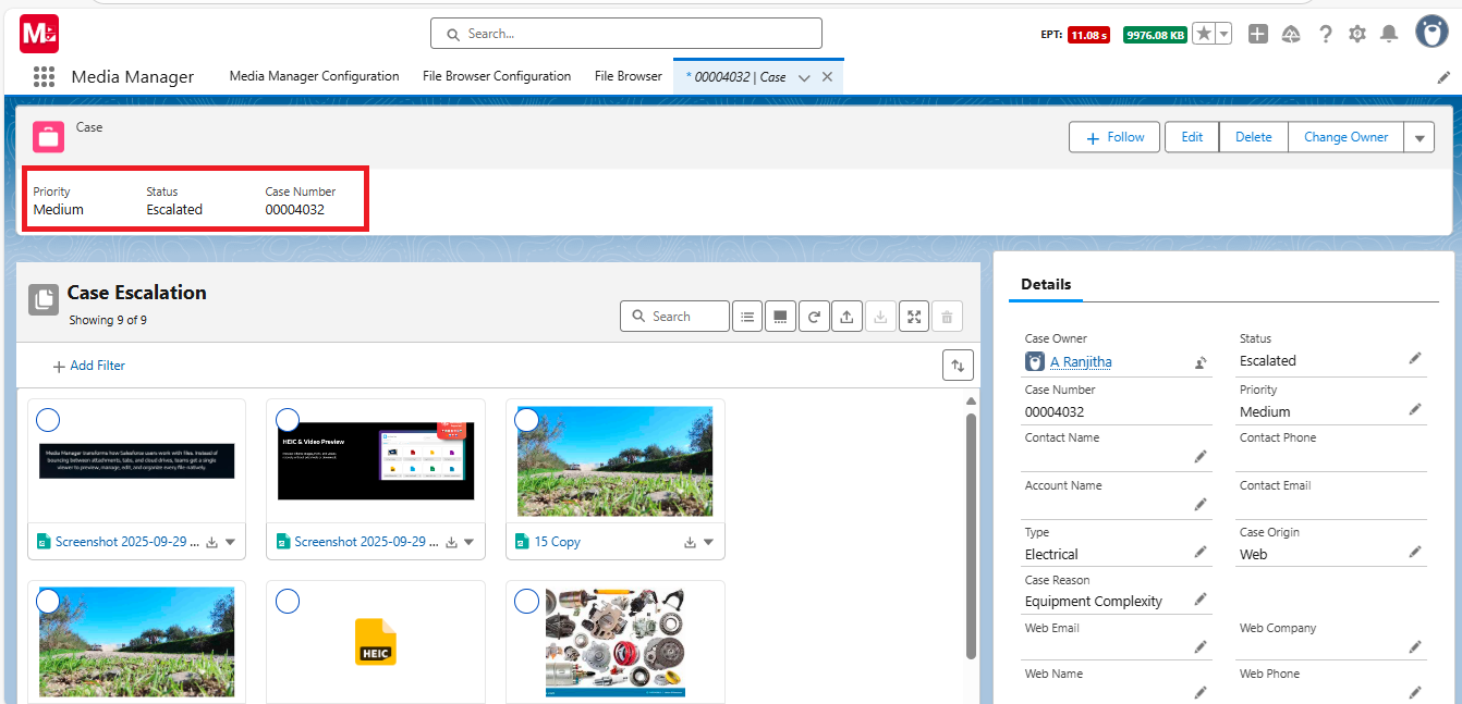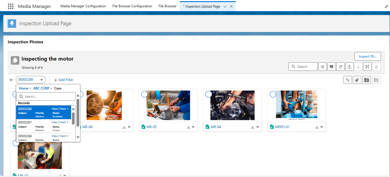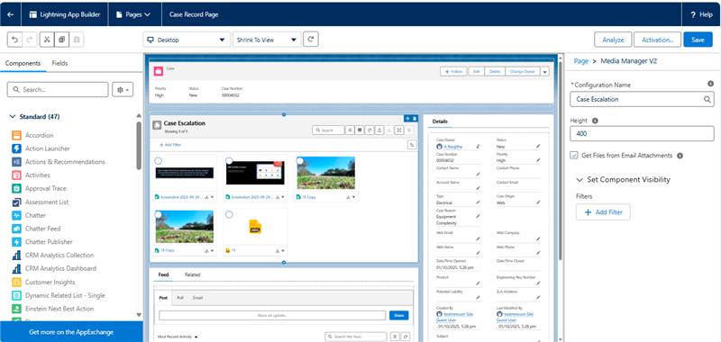 - Place Media Manager on the Record Page: Add Media Manager V2 to Case, Account, or custom object pages, and link your configuration.