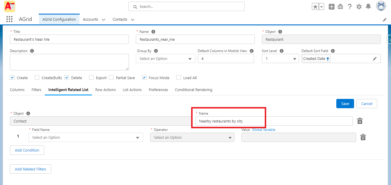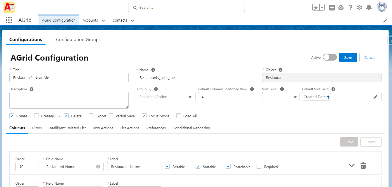 - Access AGrid Configuration: Begin by opening AGrid and accessing the Configuration for the ‘Restaurant’ Object. If you lack a tailored configuration, create a new one.