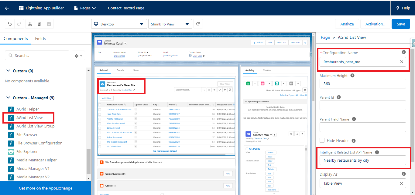 - Save and Experience: Return to the Contact record detail page and enjoy the convenience of viewing nearby restaurants based on the Contact’s billing city i.e., viewing records across unrelated objects.