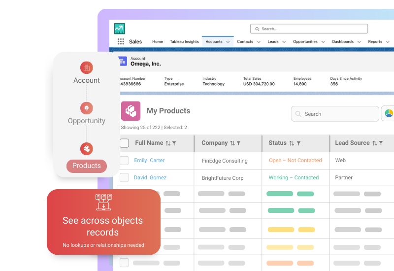 A dynamic view that shows related records- even across unrelated Salesforce objects with smart filters.