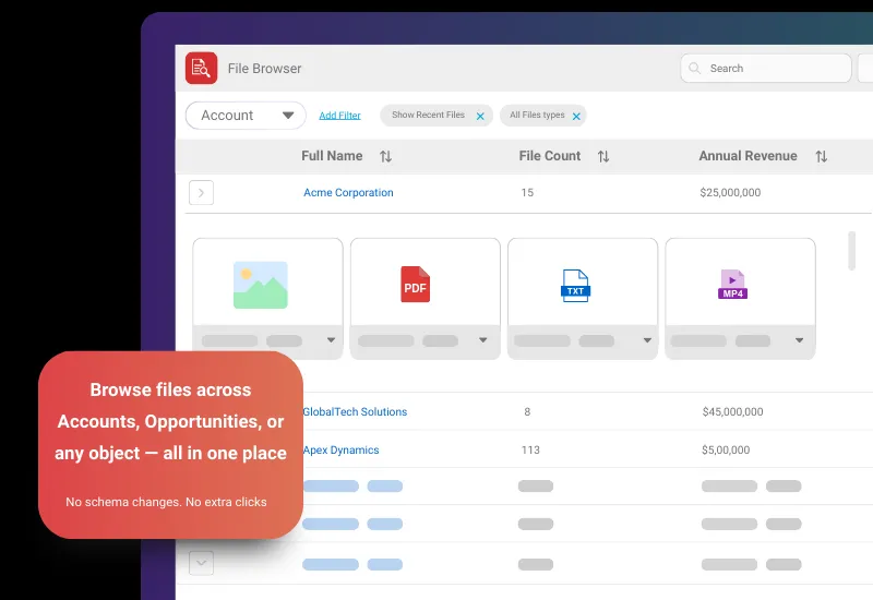 Media Manager transforms how Salesforce users work with files. Instead of bouncing between attachments, tabs, and teams get a single viewer to preview, manage, edit, and organize every file-natively.